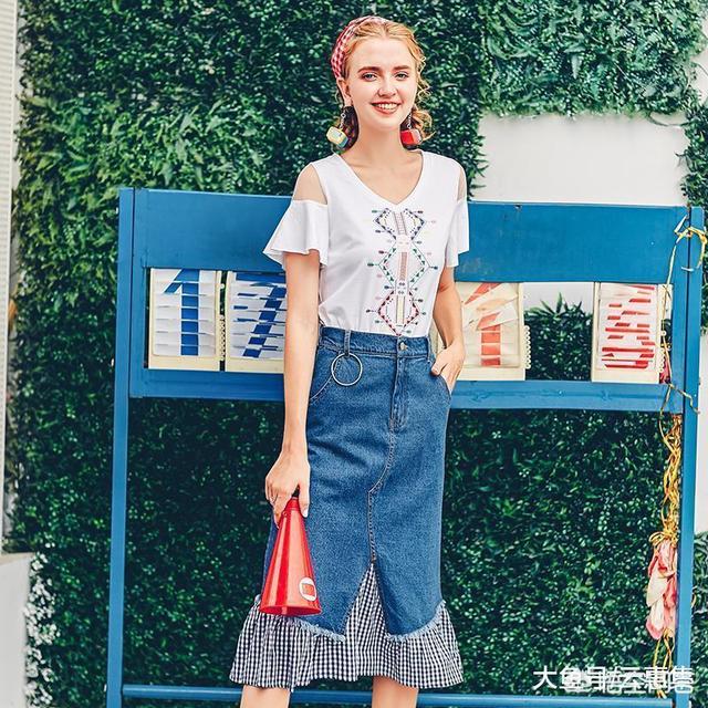中长款牛仔拼接大码半身裙,腰部可以增加腰带,增加穿着的变化性!