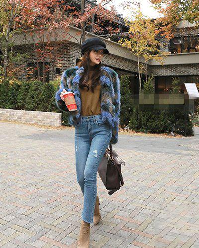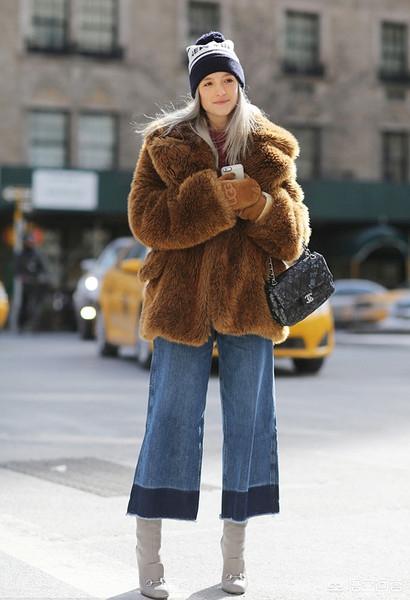 五、短皮草搭配牛仔裤。这样的搭配是比较寻常的,一般人都能hold住。露出踝关节显得整体更轻盈。