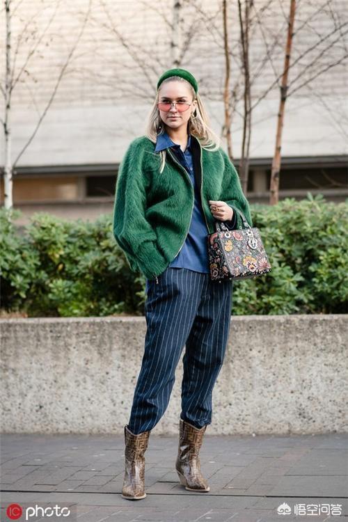 (绿色皮草本来颜色就不好搭,加上条纹西裤和切尔西靴,这样的混搭确实很显功力)