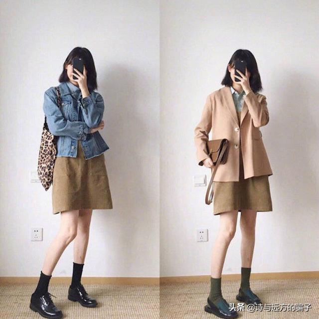 焦糖色衬衫➕黑色短裙子➕长筒袜
