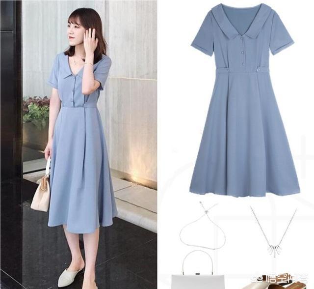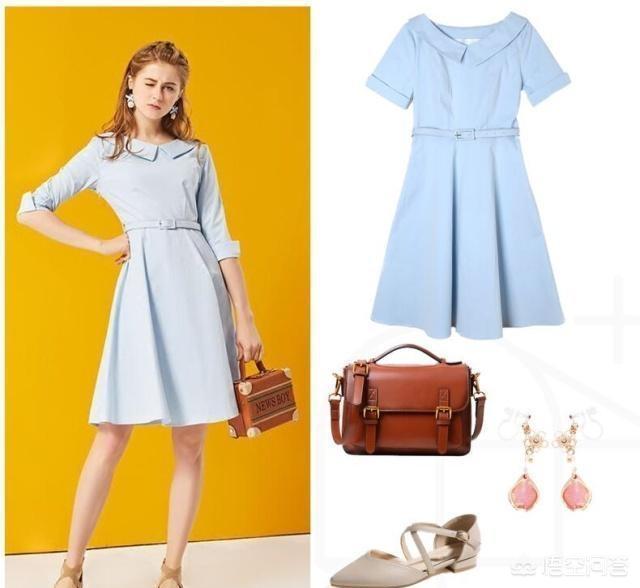 可爱的娃娃领淡蓝色连衣裙,A字的宽松版型修身显瘦,俏皮减龄。五分袖的翻折设计时尚吸睛,腰部的高腰线收腰设计,精致细腻显瘦藏肉,搭配一双绑带跟鞋,更显魅力。